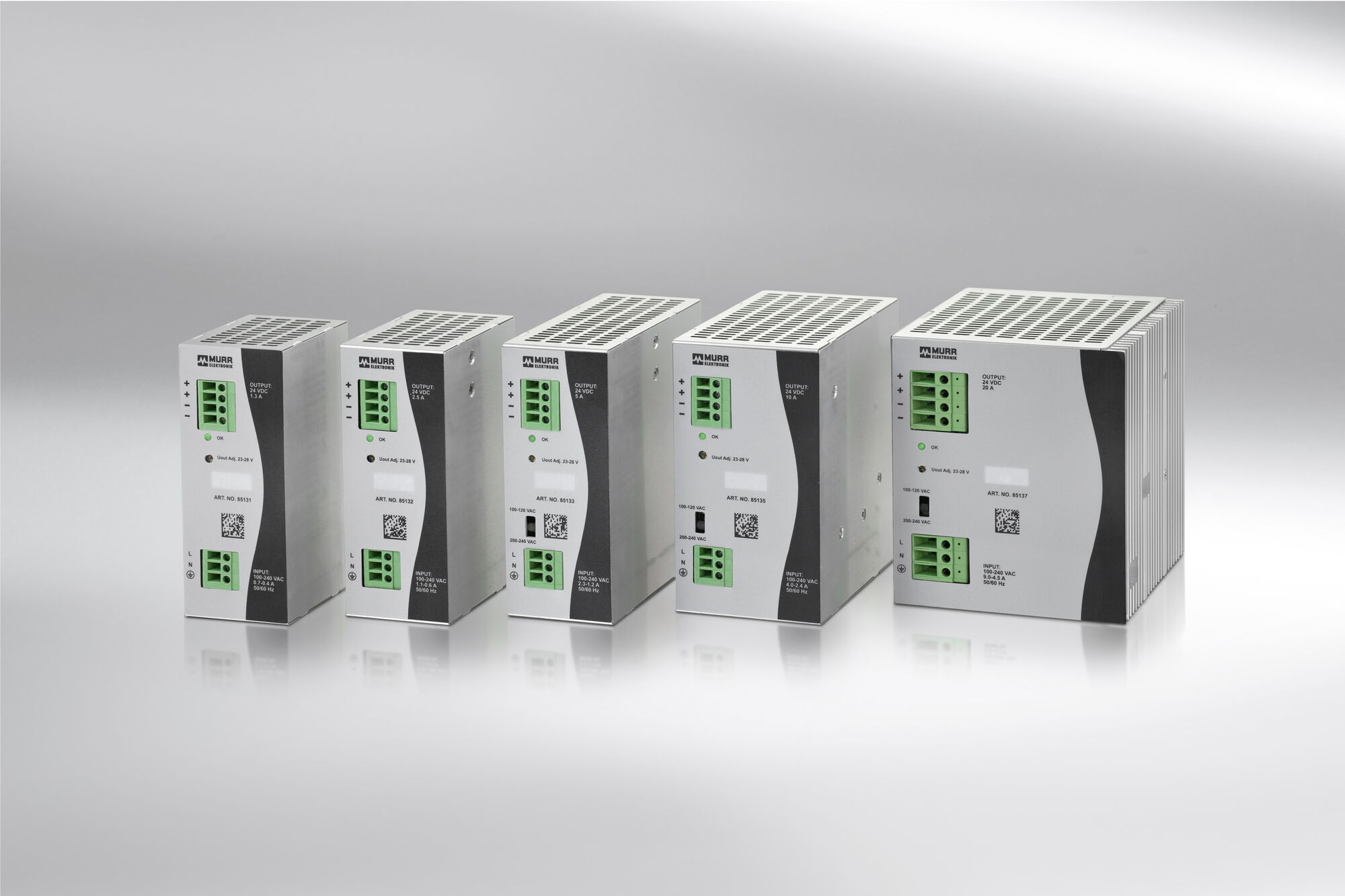 Eco-Rail-2シリーズは定格電力1.3~20Aの5種類からお選び頂けます。出力電圧は23~28Vの範囲で設定が可能。電源ラインの長さに関係なく、周辺機器に必要量の電力を供給できます。また、当電源装置を2台直列に接続していただくことで、出力電圧を48Vまで増加させることもできます。